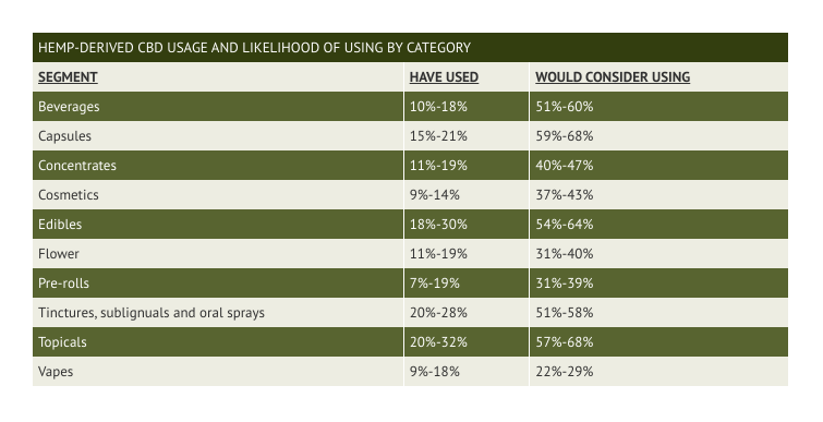 Given that consumer adoption of hemp-derived CBD topicals has already reached high levels, it seems logical that hemp-derived CBD cosmetics would be a natural extension of this in the future, but only after CBD cosmetic brand loyalty has been established.
